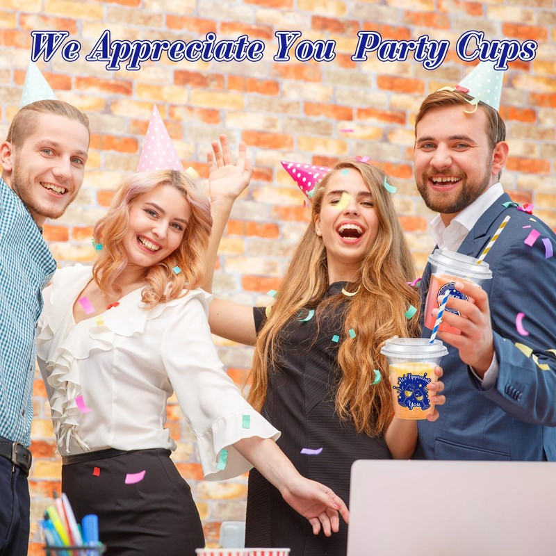 Qinyoung 60 Sets Thanksgiving Employee Appreciation Decoration Blue Gold Appreciation Cup with Lids and Straws 14 oz Employee Disposable Plastic Cups for Thank You Staff Volunteer Week