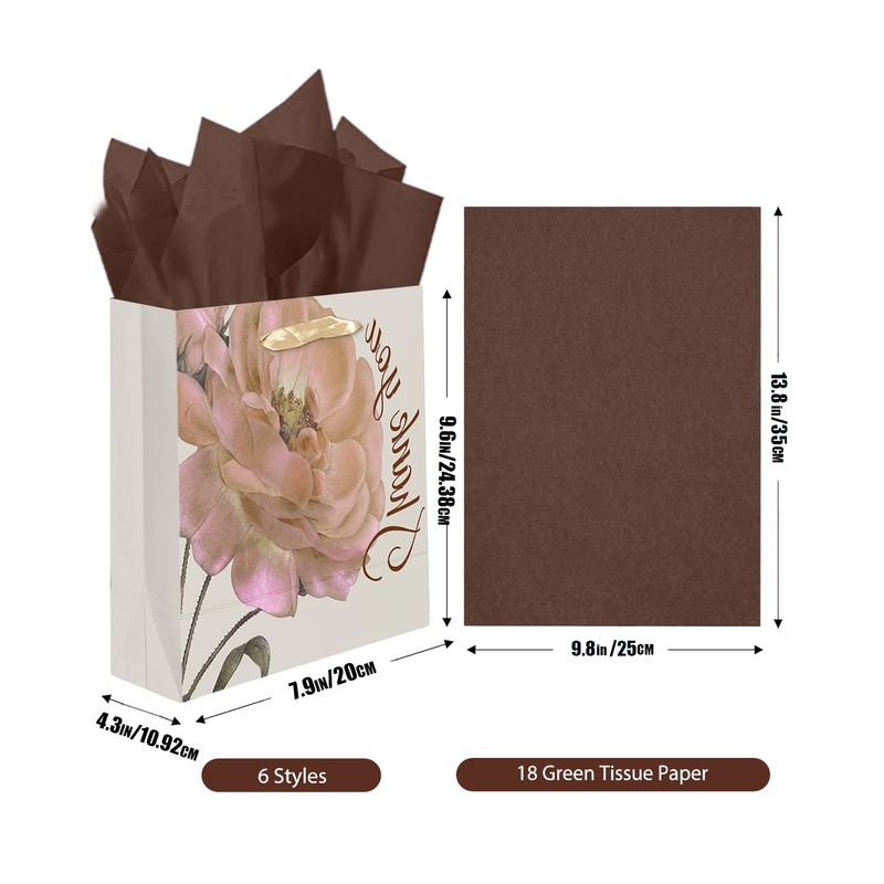 qiqee 6PCS Brown Tone Flowers Paper Gift Bags with Tissue Paper Handles Medium Size Bags(18pcs Tissue Paper )