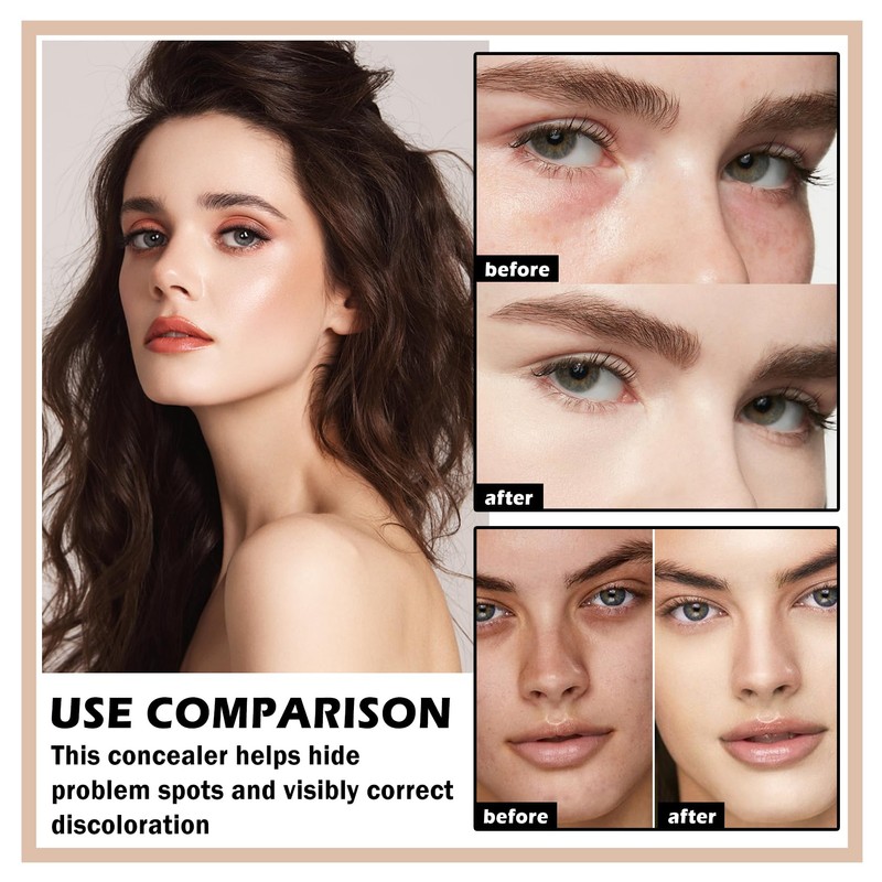 3.Multi-purpose,professional concealer can be used on the eyes,and can also be used to cover blemishes such as spots,nose wings,moles,etc.,making your face smooth and delicate,and creating a flawless and perfect makeup.