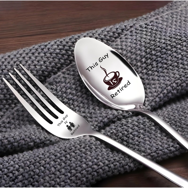 QIUHGZJX 2 Pieces This Guy is Retired Engraved Stainless Steel Spoon Fork Set...