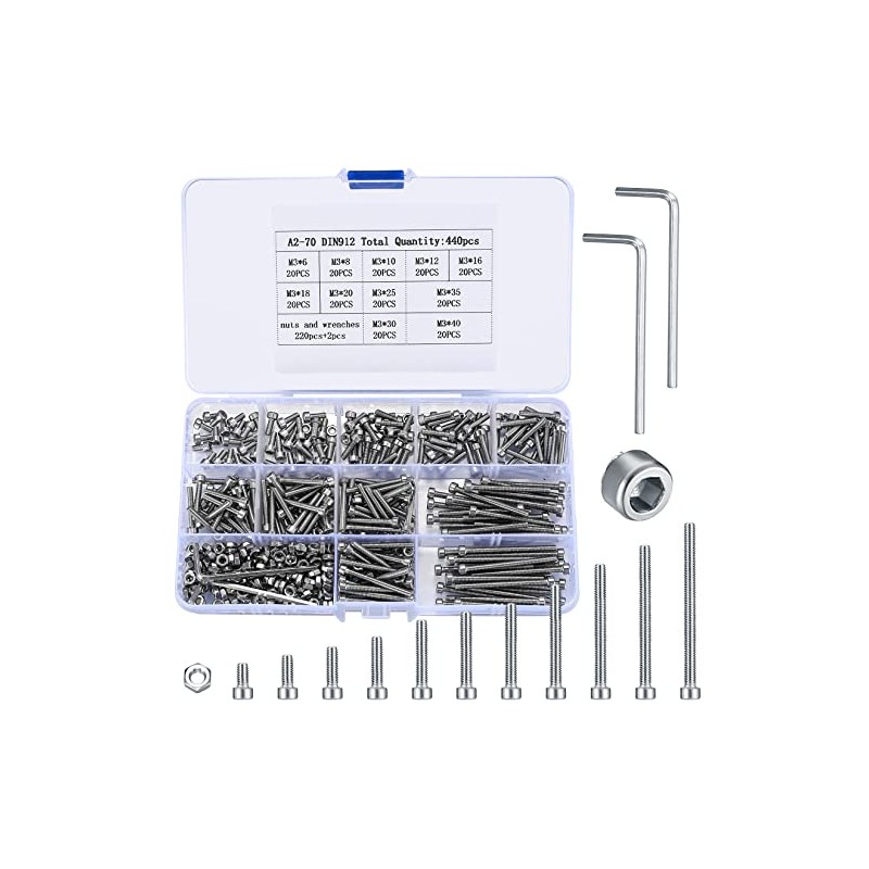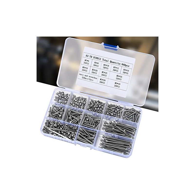 Product Information- Product Name: Hex Socket Head Cap Screws and Nuts Set- Material: Stainless Steel- Size: M3- Quantity: 440 PcsPackage Includes:220 pieces - M3 x Nuts2 pieces - Wrench20 pieces - M3 x 6 mm screws20 pieces - M3 x 8 mm screws20 pieces - M3 x 10 mm screws20 pieces - M3 x 12 mm screws20 pieces - M3 x 16 mm screws20 pieces - M3 x 18 mm screws20 pieces - M3 x 20mm Screws20 pieces - M3 x 25 mm screws20 pieces - M3 x 30mm Screws20 pieces - M3 x 35mm Screws20 pieces - M3 x 40 mm screwsFeatures:- The m3 hex screws and bolts and nuts are made of high quality stainless steel material, which is sturdy and durable.- Deep and clear hexagon socket head can make your work easier.- All hex socket head screws and bolts are packed in a storage box, easy to use, find and use.- Widely used in home and office appliance, communication equipment, ship assembly and others.- You will receive a total of 440 pieces of hex bolts, nuts and 2 x wrenches, enough for your daily use.Warm Tips- If you have any questions about using the hex bolt nut Assortment, please feel free to contact us. We will solve your questions as soon as possible.