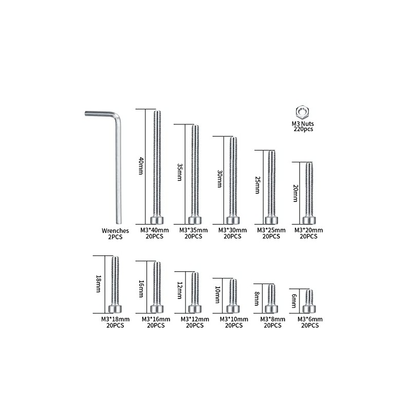 - Package Contents: You will get 220 pcs m3 x nuts, 2 x wrench, 20 pcs m3 x 6mm screws, 20 pcs m3 x 8mm screws, 20 pcs m3 x 10mm screws, 20 pcs m3 x 16mm screws, 20 pcs m3 x 18mm screws, 20 pcs m3 x 20mm bolts, 20 pcs m3 x 25mm bolts, 20 pcs m3 x 30mm bolts, 20 pcs m3 x 35mm bolts, 20 pcs m3 x 40mm bolts, a total of 440 pcs.