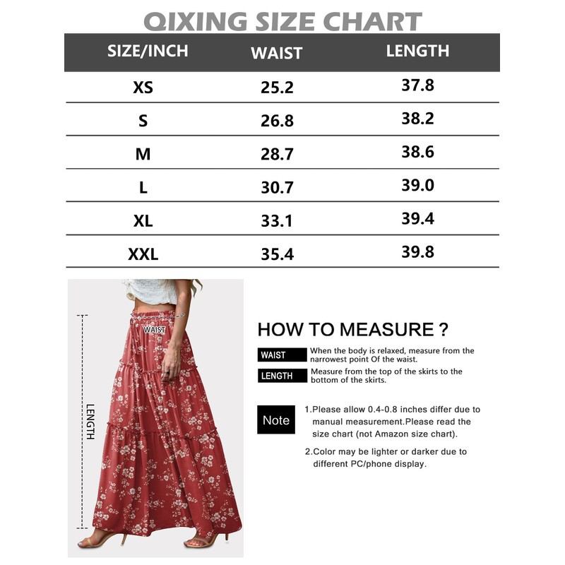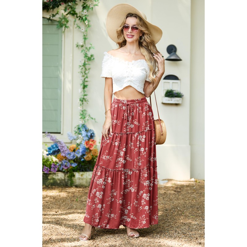 Features:High Waisted Maxi Skirts; Boho Floral Long Skirts; Drawstring Elastic Waist Cute Skirts; Tiered Ruffle Hem; Practical pockets on both sides.The flowy wide-leg design allows women of all body shapes to move freely and create perfect curves