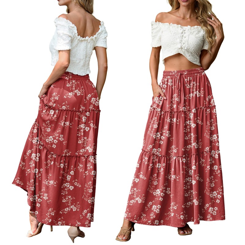 - Features: High Waisted Maxi Skirts; Boho Floral Long Skirts; Drawstring Elastic Waist Cute Skirts; Tiered Ruffle Hem; Practical pockets on both sides deep enough to hold your cell phone, wallet, keys, and more