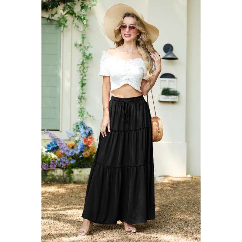 - Features: High Waisted Maxi Skirts; Boho Floral Long Skirts; Drawstring Elastic Waist Cute Skirts; Tiered Ruffle Hem; Practical pockets on both sides deep enough to hold your cell phone, wallet, keys, and more