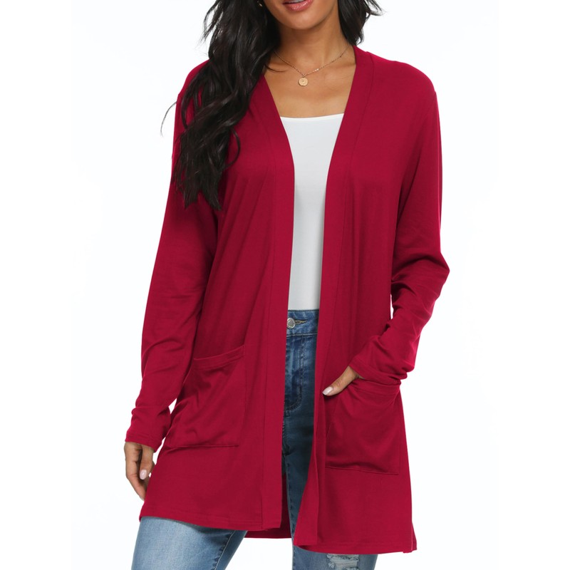 QIXING Womens Cardigans with Pocket Lightweight Long Sleeve Open Front Cardigans for Women UK Elegant Casual Ladies Boyfriends Cardigans for Spring Summer Autumn (Red, L)