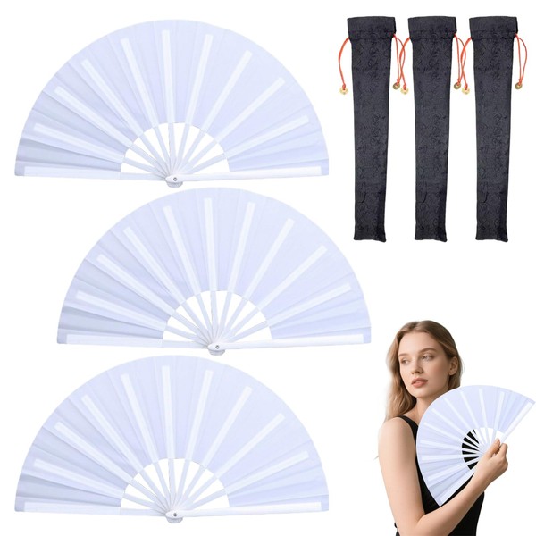 QIYUDA 13inchs Glitter Large Folding Popping Fan Line Dancing Fan, Big Foldable Boots on The Ground Hand Handheld Line Dance Clap Fans (3, 3 Pcak White(Not Glitter))