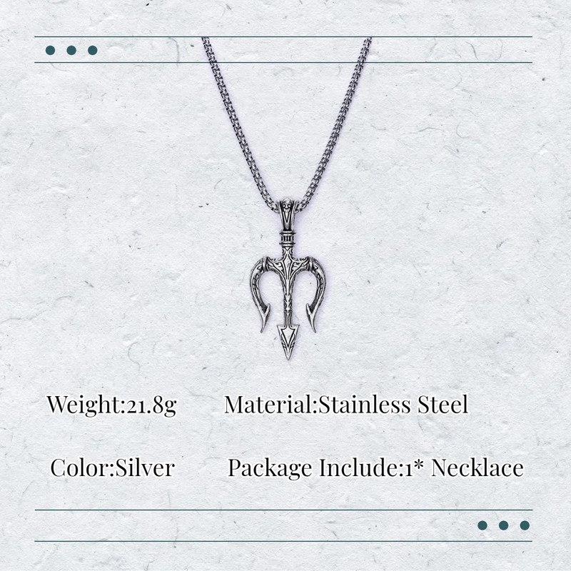 QKEOISUD Poseidon Trident Pendant Punk Necklace, Vintage Stainless Steel Rock Hip Hop Chain Ancient Greek Talisman Birthday Jewelry Men's Gift (Silver)