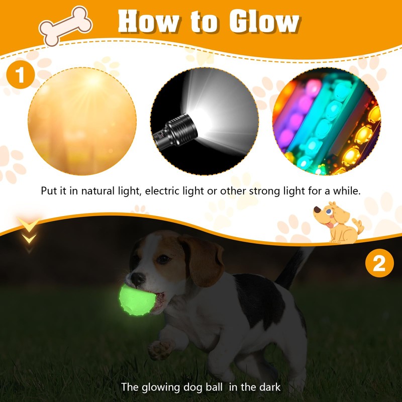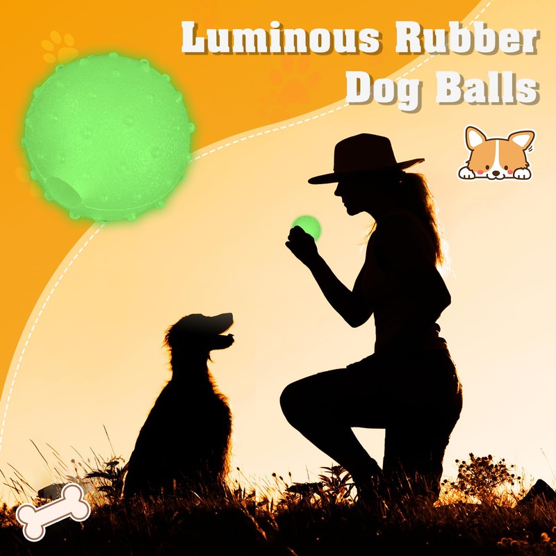 - Glow in the Dark The glowing rubber dog ball glows in the dark after being exposed to bright light for a few minutes. The light duration of the glowing ball in the dark depends on the light intensity and exposure time.