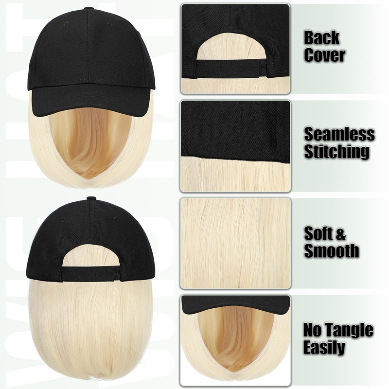 - Specification & Material: Baseball cap with straight bob hair is 14inch. The hairpiece is 8inch and weight about 0.3ib. The baseball cap wig is made of high quality synthetic fiber. Full, soft and tangle-free