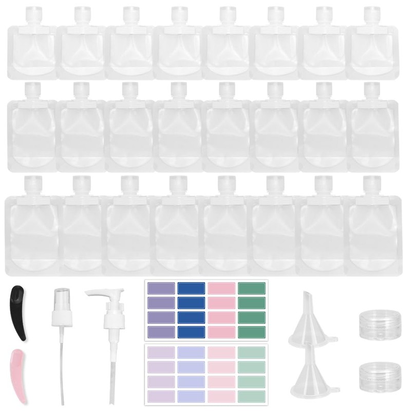 - 【Package Includes】Our 24pcs travel pouches for toiletries include a perfect mix of sizes—8 x 30ml liquid pouches, 8 x 50ml liquid pouches, 8 x 100ml liquid pouches, and are also paired with 2 x 5g dispenser boxes, 2 x mini spatulas, 2 x funnels, 2 x pressers and 2 x stickers to help you differentiate between the markers. This set ensures you have the right containers for all your essentials like shampoo and lotion!