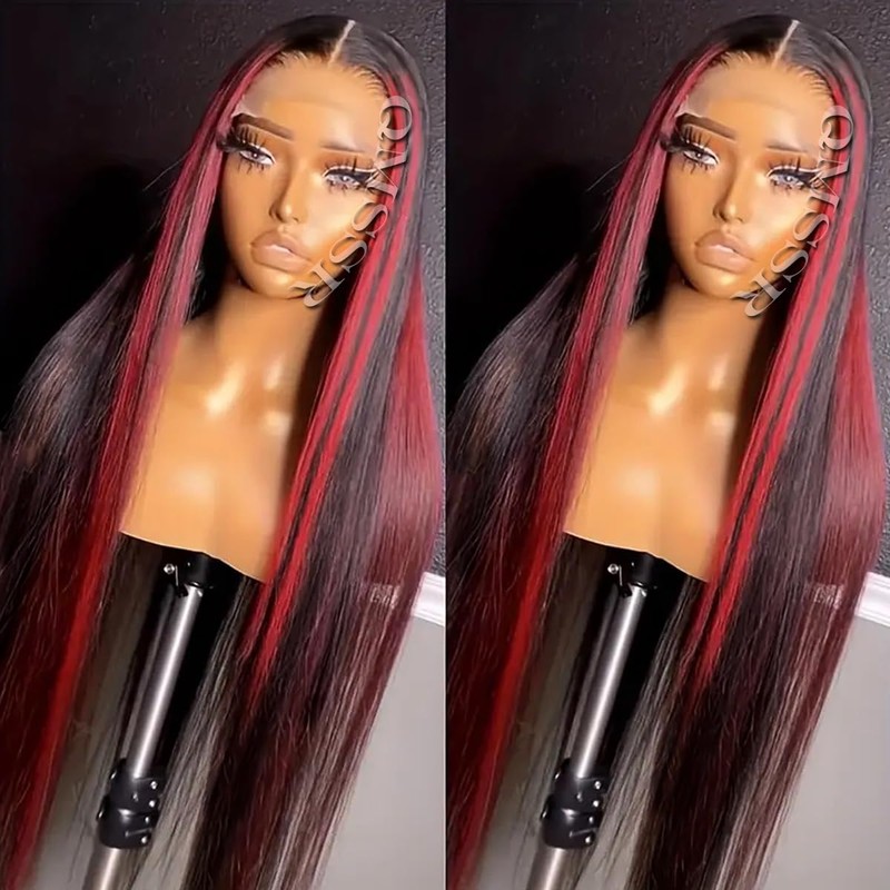 Red Highlight 13X4 Lace Front Wig Synthetic Hair Pre Plucked 24 inch Long Silky Straight Black with Red Skunk Stripe Ombre Colorfull Wig for Women