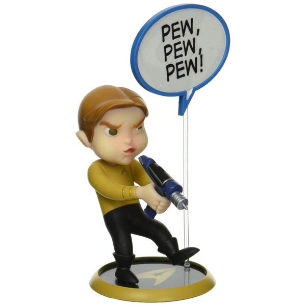 Give our favorite starship captain an impossible challenge and chances are he'll find a clever comeback -- improvising all the way. But what epitomizes James T. Kirk is his sheer determination in the face of overwhelmingly bad odds: He doesn't like to lose -- ever. Remember the Kobayashi Maru training exercise at Starfleet Academy? Kirk reprogrammed the simulator, emerging victorious in a no-win scenario. If you tell him something's not feasible, he'll find a way to make it happen. We've captured that gleeful intensity in our Trekkies Kirk Q-Pop Figure, with James Tiberius decisively aiming his phaser, leaving no question that his shot will be dead-on. Designed by Mohammad Haque, this figure stands approx. 4.5 Inch tall and is made of high- quality PVC. It includes a word bubble and special Trekkies marker, so that you can add quotes or "sound effects." Kirk is just one in our series of Trekkies Q-Pop Figures, so be sure he's not alone on the bridge!
