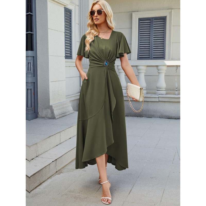 QMZ Wedding Guest Dresses for Women Have Pockets Cocktail Dress Ruffle Sleeve A Line Evening Party Formal Dresses for Women-Army Green-L