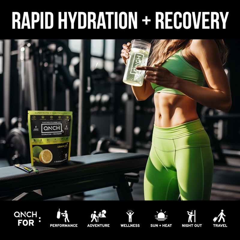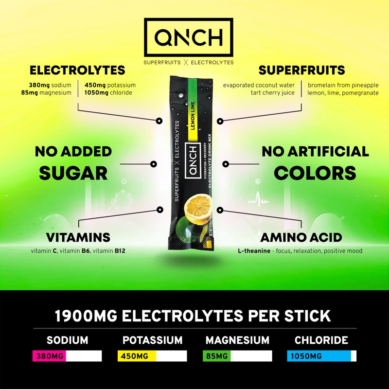 Experience the refreshing taste of QNCH Lemon Lime, the ultimate superfruit electrolyte drink crafted for rapid recovery. Bursting with a natural lemon lime flavor, our drink mix packs over 1900mg of electrolytes to keep you hydrated and energized, backed by real superfruits with recovery benefits, such as: tart cherry juice, bromelain (from pineapple), pomegranate juice, lemon juice, and lime juice. With no added sugar, artificial colors, or artificial flavors, QNCH Blue Raspberry is also vegan-friendly, non-GMO, and perfect for an active lifestyle. Grab your 15-pack today and quench your thirst with nature's best hydration.