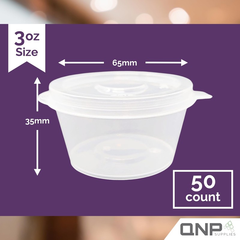 QNP Supplies 50 Count 4oz Clear Plastic Disposable Portion Cups with Hinged Lids, Sauce, Samples, Jello, Souffle Cups