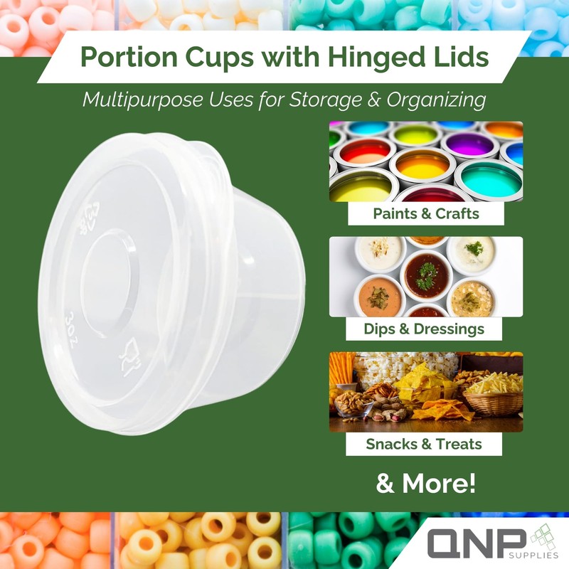 - CONVENIENT DESIGN: Never look for matching lids again! Our portion cups with attached hinged lids made it quick and efficient to sort, fill, & store. These disposable mini cups ensure your to-go orders and takeout delivery stays fresh and mess-free. Quickly portion out salad dressings and toppings with our snap tight and durable lids.