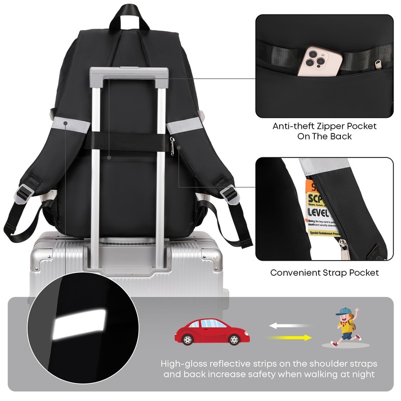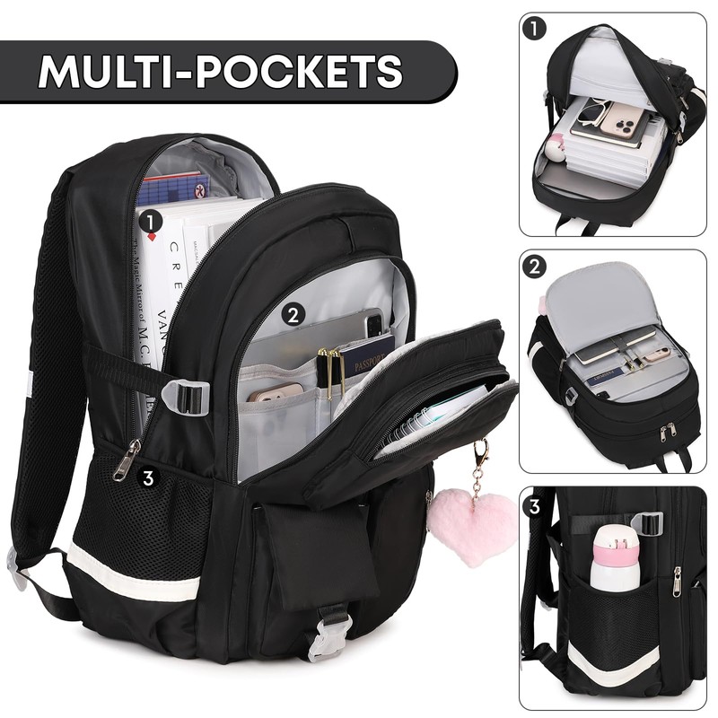 - The backpack for school has 5 separate different size pockets and two side pockets meet daily storage. The front three pockets can hold charge device and other small items, convenient for your daily organization. The main pocket of includes laptop padded sleeve with elastic belt and hidden inner zipper pockets. The front tool pockets also come with multiple compartments to provide roomy space for necessities