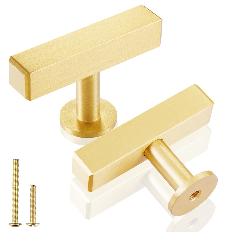 QOGRISUN 5-Pack Solid Brass Cabinet Knobs, Gold Square T Bar Cabinet Pulls, 2 Inch Hole Center for Kitchen Dresser Drawer Cupboard, Brushed Brass Finish