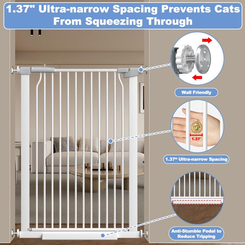 - 5.【1.37" Ultra Narrow Spacing】The Gap between each two bars are only 1.37",the pets or small animals can't escape or caught by the cat door.After manual testing, the 40.55 inch tall baby gate can withstand 180 pounds of pull.