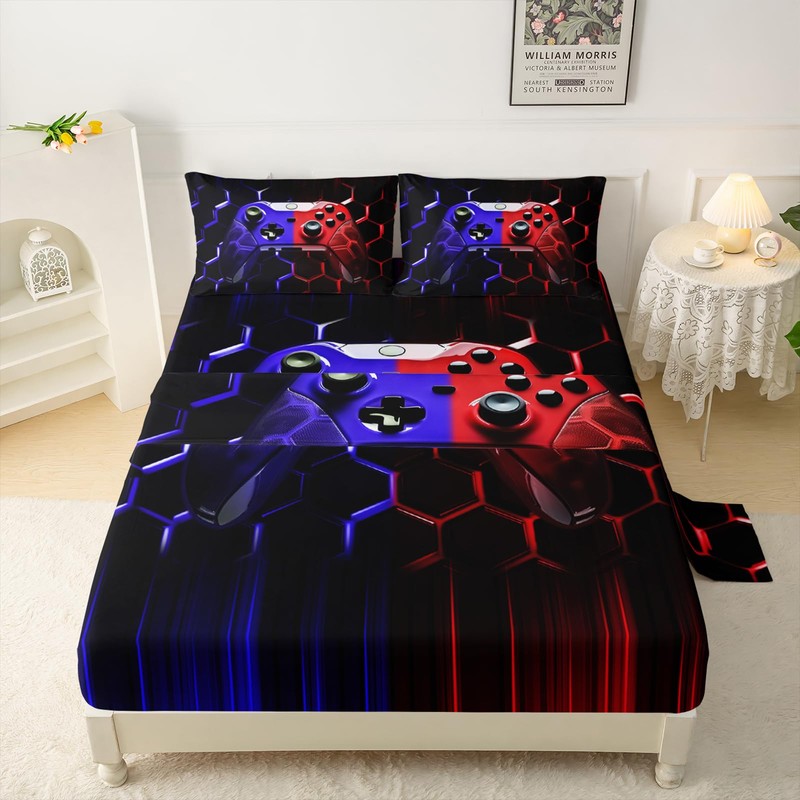 QOOMO Game Console Bedding for Boys and Girls Blue Red Gamepad Kids Sheets Set Honeycomb Gaming 3D Super Soft Kids Bedding Set Twin Size 1 Fitted Sheet, 1 Flat Sheet, 2 Pillow Cases