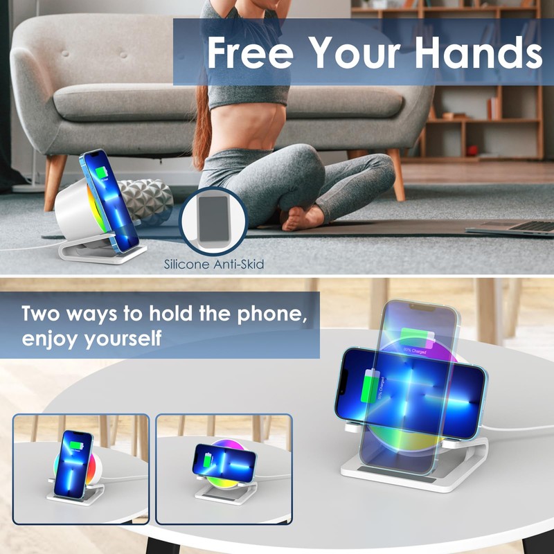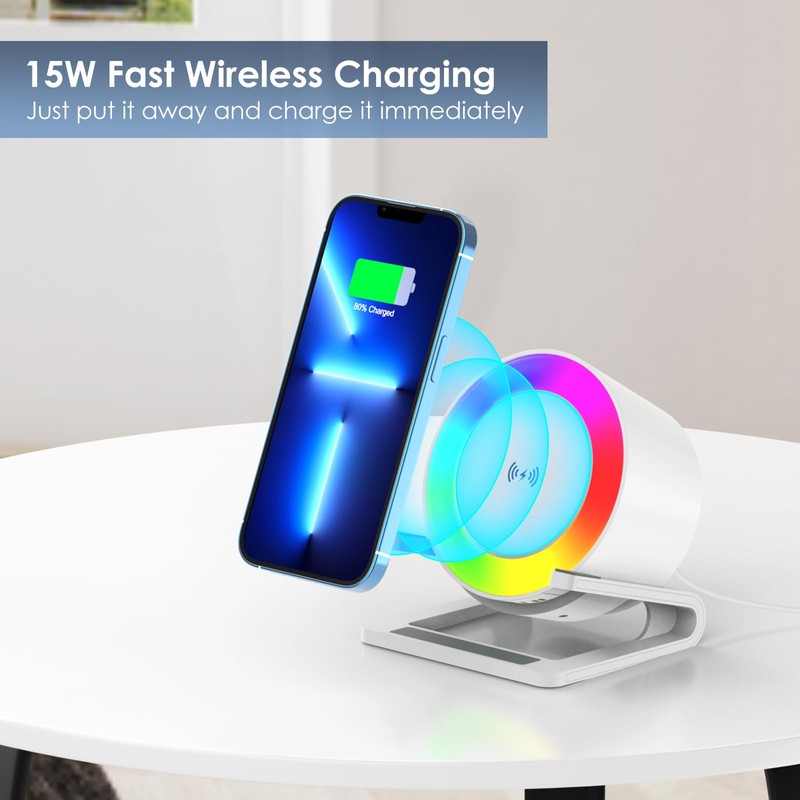 Verbessern Sie Ihre Ladeerfahrung mit unserem multifunktionalen kabellosen Ladegerät. Verabschieden Sie sich von verwickelten Kabeln, genießen Sie hochwertigen Klang, passen Sie die Beleuchtung an Ihre Stimmung an und führen Sie mühelos Anrufe.