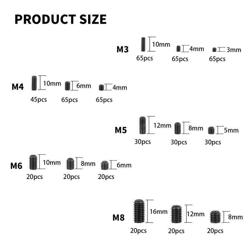 - Package Includes: 580 pcs in total, 65 pcs for each size: m3x3mm, m3x4mm, m3x10mm, m4x4mm, m4x6mm, and 45 pcs m4x10mm, 30 pcs m5x5mm, 30 pcs m5x8mm, 30 pcs m5x12mm, and 20 pcs for each size: m6x6mm, m6x8mm, m6x10mm, m8x8mm, m8x12mm, m8x16mm, the quantity is sufficient and the size is rich to meet the needs of different occasions and fields.
