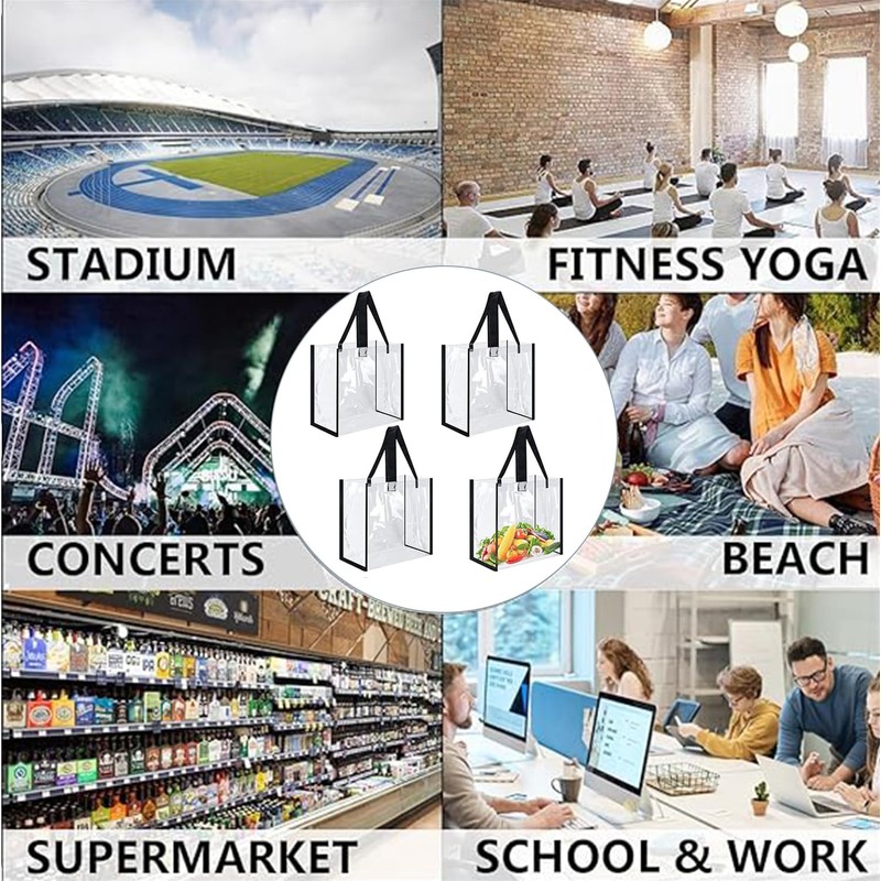 - 【Quantity and Size】: You'll receive a set of 4 large clear tote bags, each measuring approximately 12 x 12 x 6 inches. With ample size and quantity, these bags are perfect for your daily use and sharing needs.
