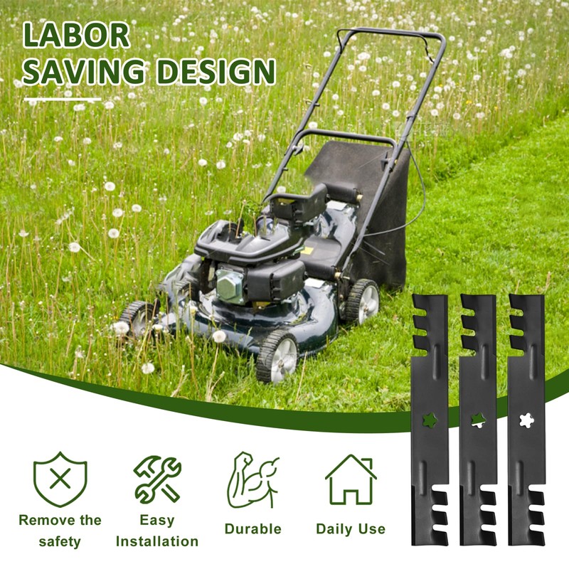 - Specification: Mower blade replacement includes 3 blades, length 16-3/4 inches, Width 2-1/2", Thickness 0,204", Center Hole 5 point star. The length of the blade is measured diagonally from one end to the other.
