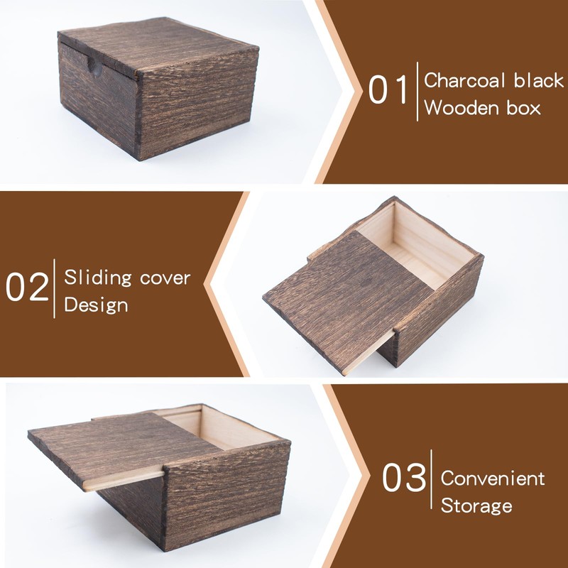 This small wooden gift box with sliding lid is the perfect blend of rustic charm and functional design. The carbonized finish gives it a deep, rich tone and highlights the natural wood grain for a vintage aesthetic that suits any decor and occasion.