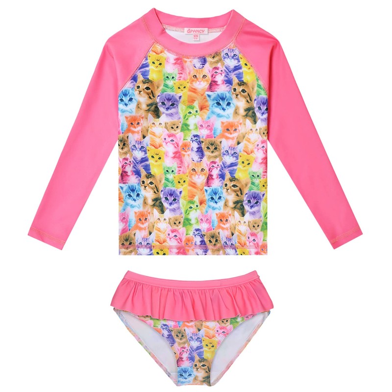 - Camiseta de protección para niñas pequeñas de 7 a 16, trajes de baño de gato rojo, trajes de baño de dos piezas, camisas de manga larga y parte inferior con volantes