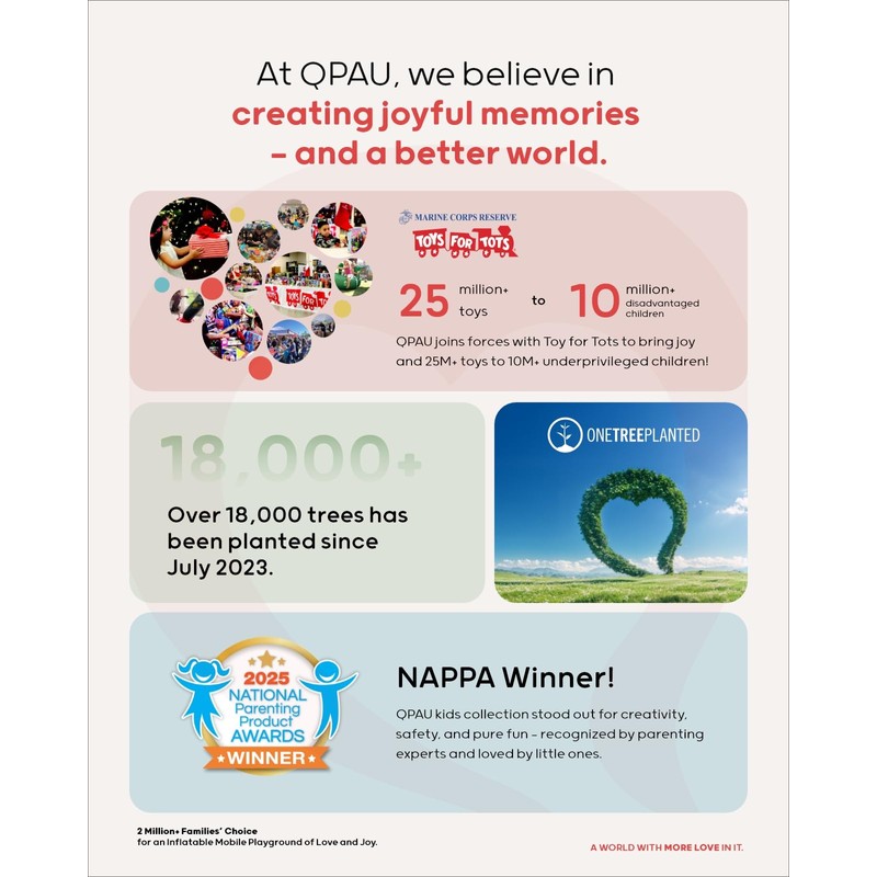 Founded in 2015, QPAU is committed to providing high-quality inflatables for kids and families. Over years of hard work, we have made some of our products the best inflatables on Amazon. The mission ‘Inflating families and kids with more joy and love’ motivated us and urged us to go such far.