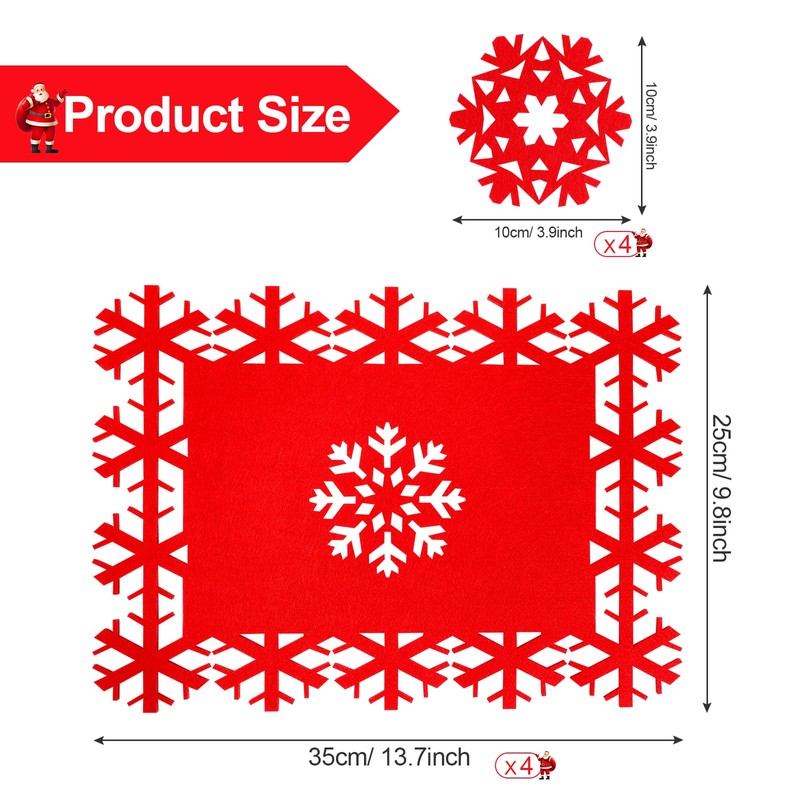 - Material and Size: Our Christmas placemats and coasters are made of felt, which are of good quality, strong and durable. Can be stored and reused. Christmas table mat size is 13.7x9.8 inch (35x25 cm), snowflake coaster size is 3.9x3.9 inch (10x10 cm).