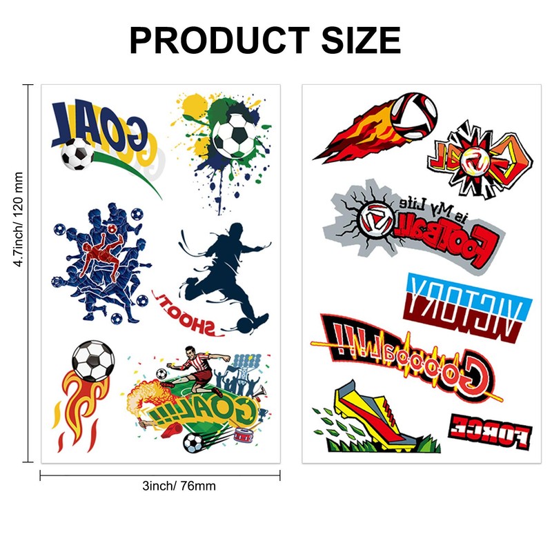 - Kids Football Temporary Tattoos Set- 10 sheets( 65 Pcs) for boys, girls, children, each sheet tattoo size is 4.7x2.95 inch/12x7.5 cm. Contains football, football players, trophies, I LOVE FOOTBALL and other patterns, perfect for watching football matches, posted on the face!