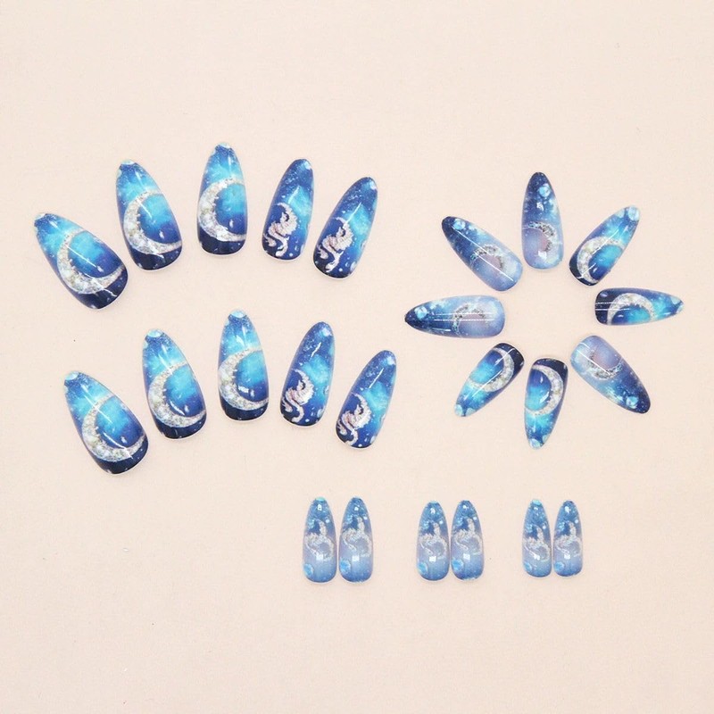 QQPPOLIU Blue Fake Nails Almond Press on Nails Medium Length with Glitter Design Stick on Nails Gift for Women 24Pcs