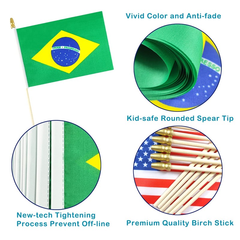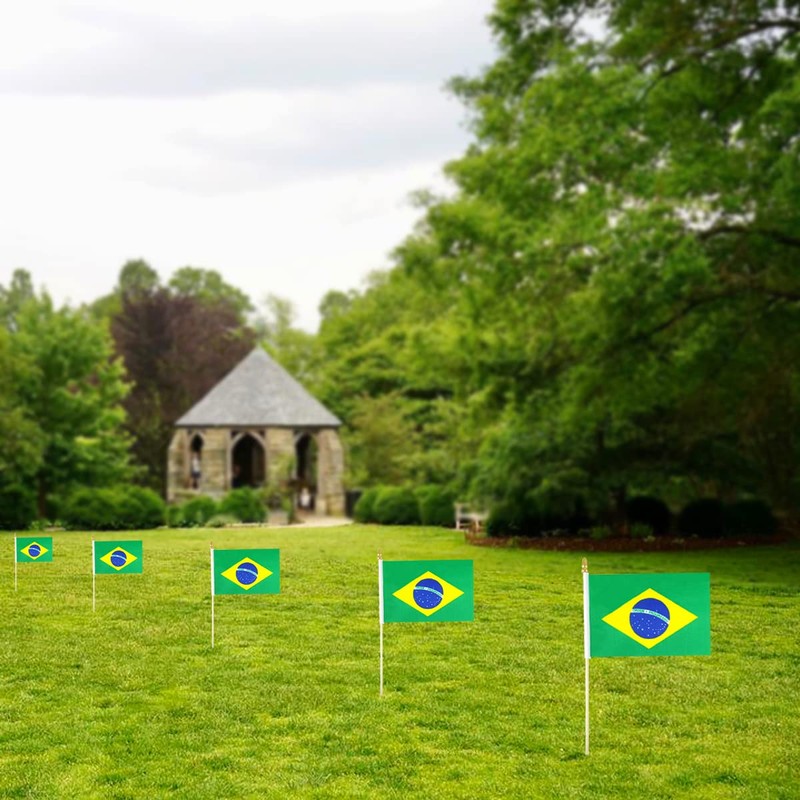 - FEATURES: Set of 12 Brazil flags on stick, 5.5x8.2 Inch flag with 12.6 inch wooden stick