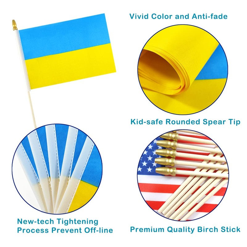 - FEATURES: Set of 12 Ukraine flags on stick, 5.5x8.2 Inch flag with 12.6 inch wooden stick
