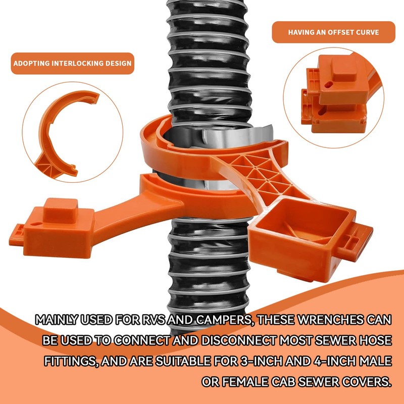 • How to Use: Multi-purpose RV sewer hose wrench adopts interlocking design with offset curves The two wrenches need to be used together, which can fit well and fit into the groove of the sewer hose connector. Once interlocked, you need to hold the wrench in each hand and twist in opposite directions to connect and disconnect easily
