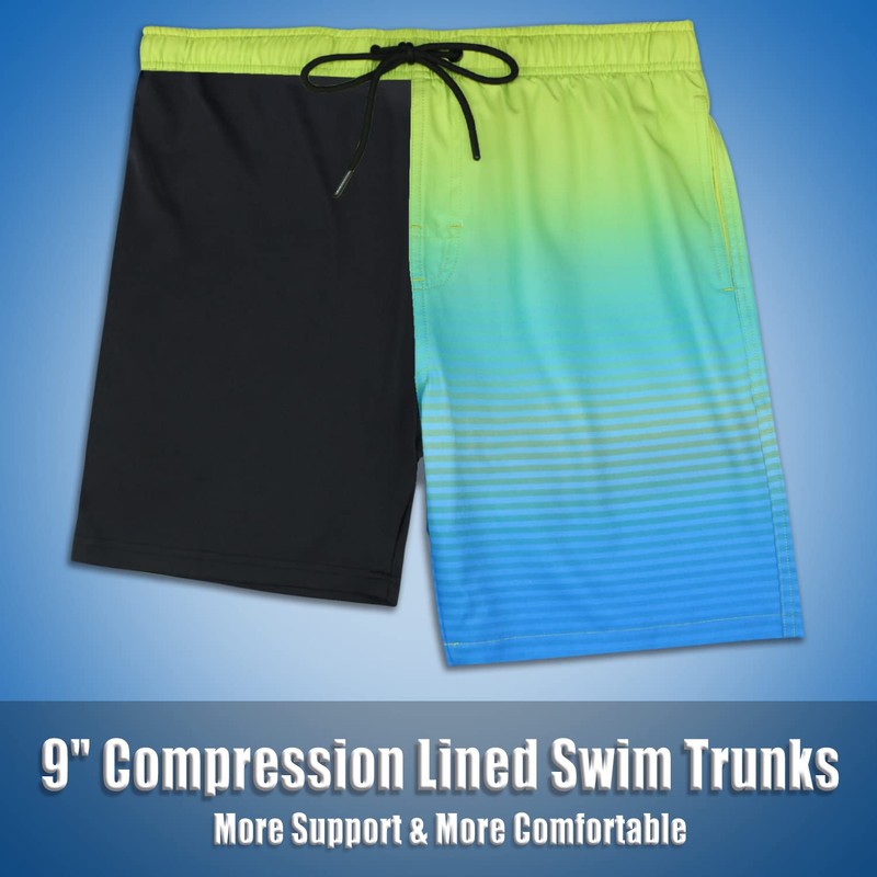 - New Generation Swimming trunks men Compression Liner 9 inch inseam tall Design: It has a smooth compression lining which is a lightweight, ultra-supportive, anti-chafing boxer brief liner to provide breathability and support in those moments when you need it most. It could protect your skin more than the old mesh net style swim trunks.