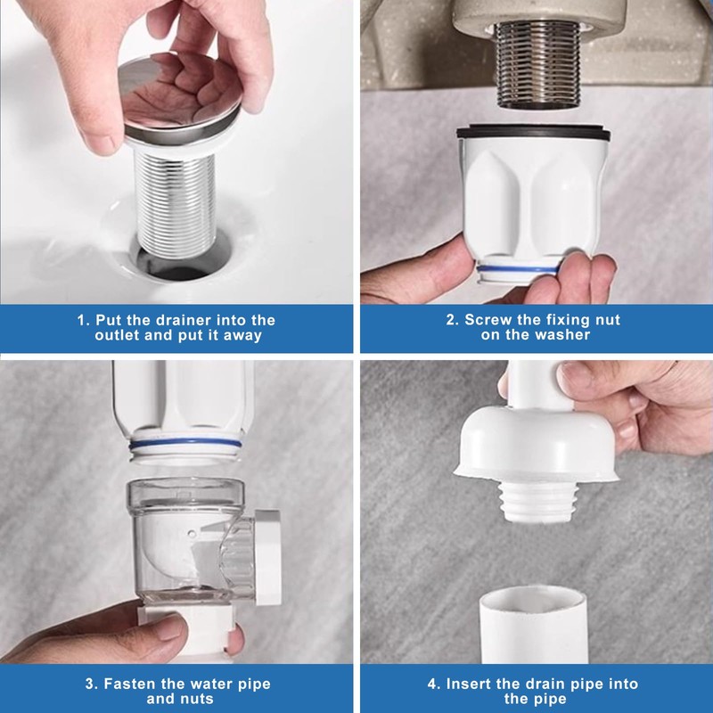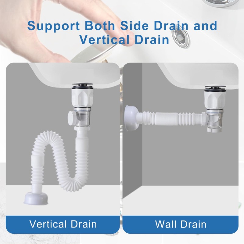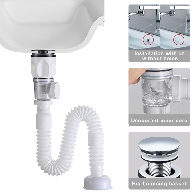 - 【Easy to Install & Space Saving】The simple construction of the sink pop-up drain makes it easy for anyone to install by hand. Remove the old bathroom sink drain and follow the video installation instructions, which take only 3 or 5 minutes to complete. The expandable flexible drain pipe makes installation simple and allows you to create the shape you desire to save space.