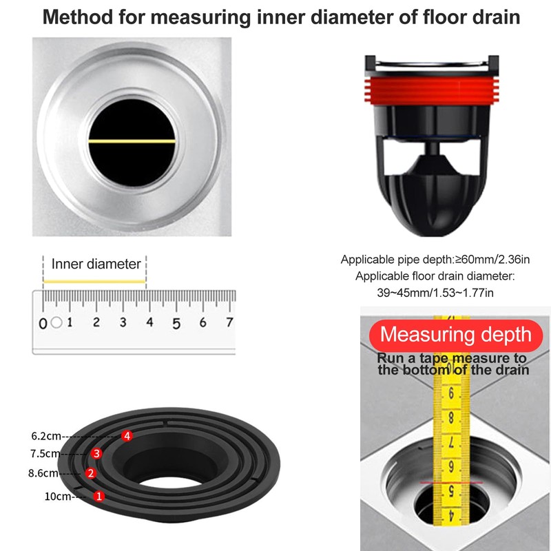 - [Product size] The rubber texture size ofthis shower room floor drain cover can be cut and adapted according to the sizeof your own floor drain cover, and fits tightly to the bathroom drain. Themagnetic levitation floor drain filter is suitable for floor drain pipes with adiameter greater than 1.67in and a height greater than 2.25in.