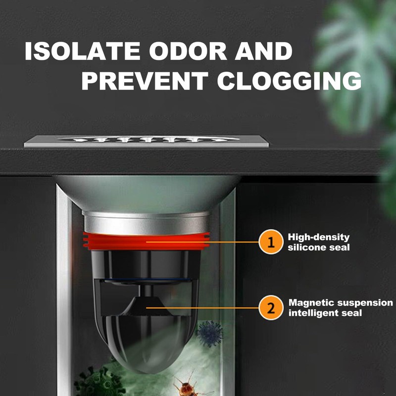 - [Unique and worry-free design] The uniquemagnetic levitation one-way water flow check valve design, anti-backflow andanti-odor design, protects the fresh air in the bathroom. The consideratedesign of the outer cover prevents hair and garbage from flowing into the floordrain and causing the bathroom drain pipe to be blocked, reducing the floordrain cleaning work and making it more relaxed.