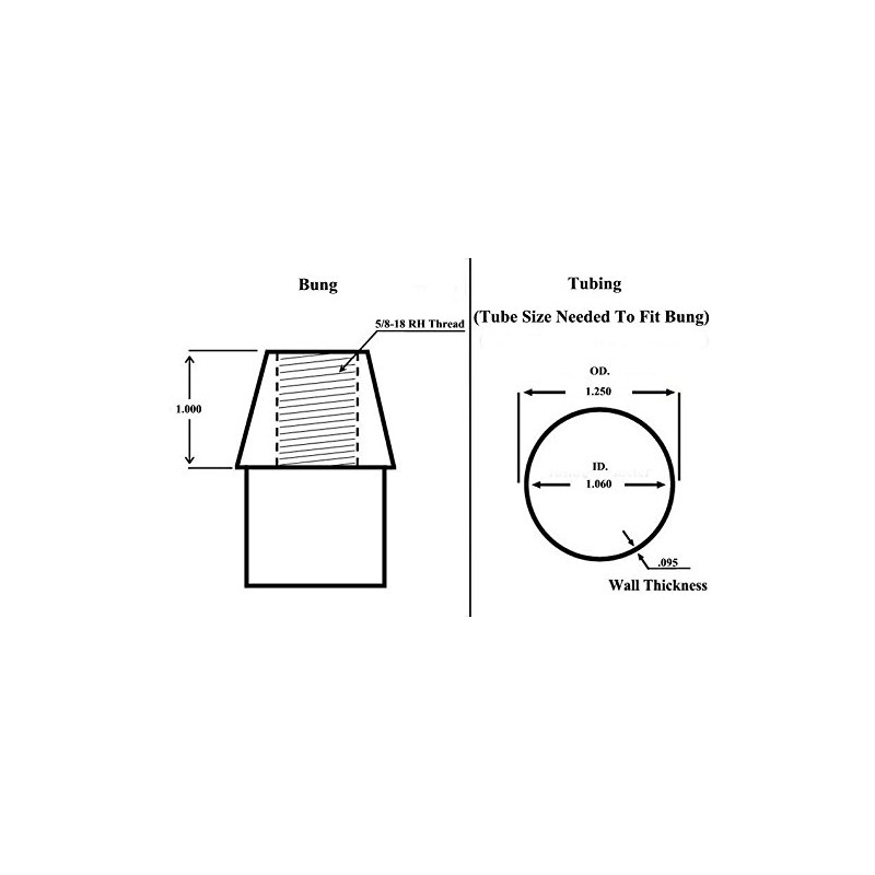 - Bung Specs: 1045 Mild Steel, Thread: 5/8-18, Fits tube Size: 1-1/4 OD X 1.060 ID X .095 Wall