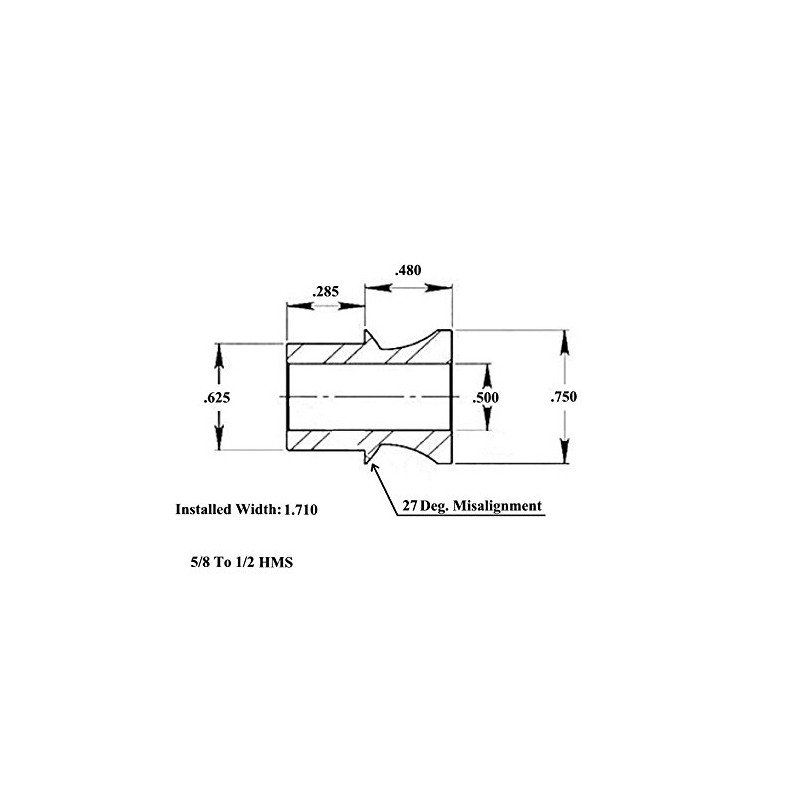 - High Misalignment Spacer Specs: 1045 Mild Steel Zinc Plated, Insert Dia: .625, Inside Bore: .500, Outside Boss Dia: .745, Overall Length In Ball: 1.710, Approx. Degrees: 27