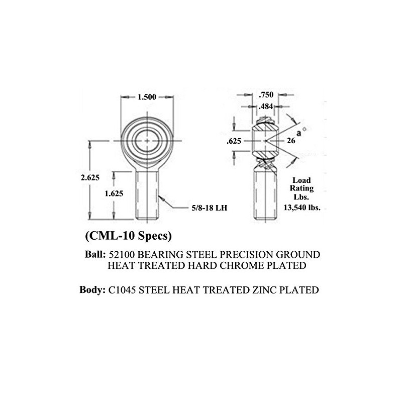 - Rod Ends Specs: Body: C1045 Steel Heat Treated, Ball 52100 Bearing Steel Precision Ground Heat Treated, Bore: .625, Ball Width: .750, Thread: 5/8-18, Load Rating: 13,540