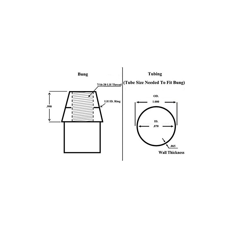- Bung Specs: 1045 Mild Steel, Thread: 7/16-20, Fits tube Size: 1" OD X .870 ID X .065 Wall