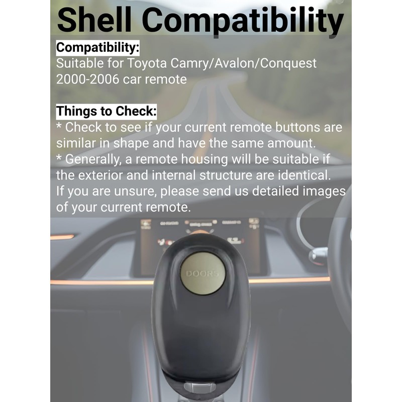 - Compatibility - Suitable for Camry/Avalon/Conquest 2000-2006 car remote. Before purchasing, please check that your car belongs to the above and current remote looks identical to ours (buttons are similar in shape and have the same amount).