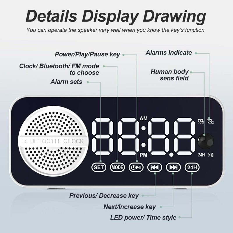 - Human Body Sensing Technology: Say goodbye to fumbling in the dark to find the snooze button. Our alarm clock speaker is equipped with human body sensing technology, which detects your movement and automatically turns on the display and backlit buttons when you approach it. It's a convenient feature that adds a touch of modernity to your daily routine.