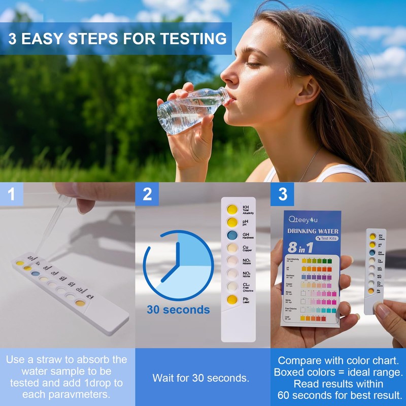 - EASY TO USEHome water testing kit is designed for simplicity, with just 3 steps to get accurate results in seconds, making it ideal for school projects and any water testing needs. Add 1drop water sample to each parameters, wait for 30 seconds, Compare with color chart. (Read results within 60 seconds for best result)