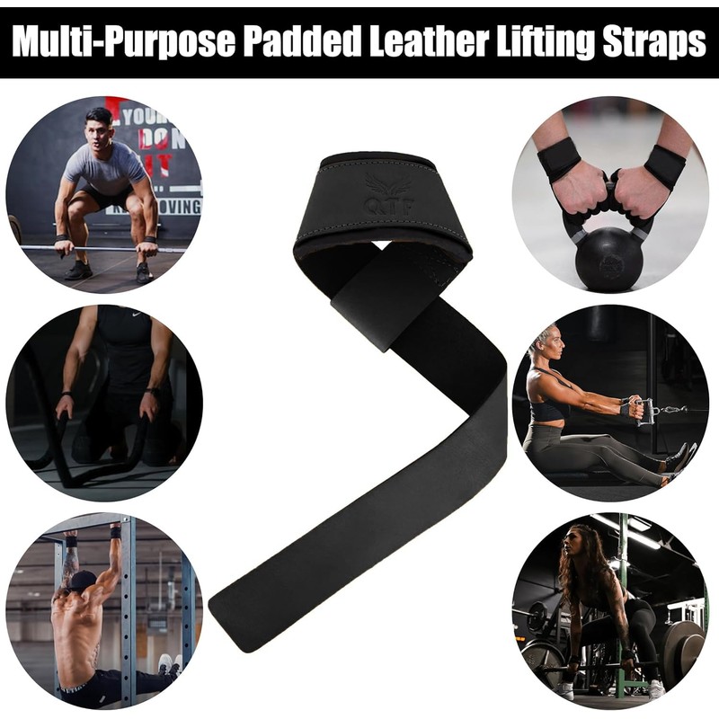 QTF Genuine Leather Lifting Straps, Wrist Assistance for Heavy Pulls, Weightlifting Bodybuilding, Gym, Fitness Accessories,Strength Training, Powerlifting, & Deadlifts (Black)